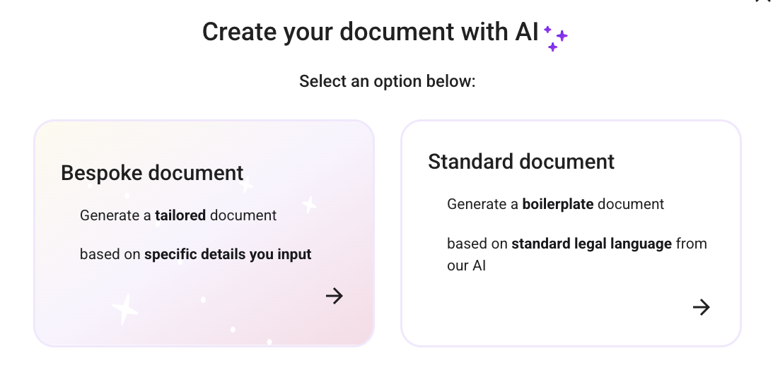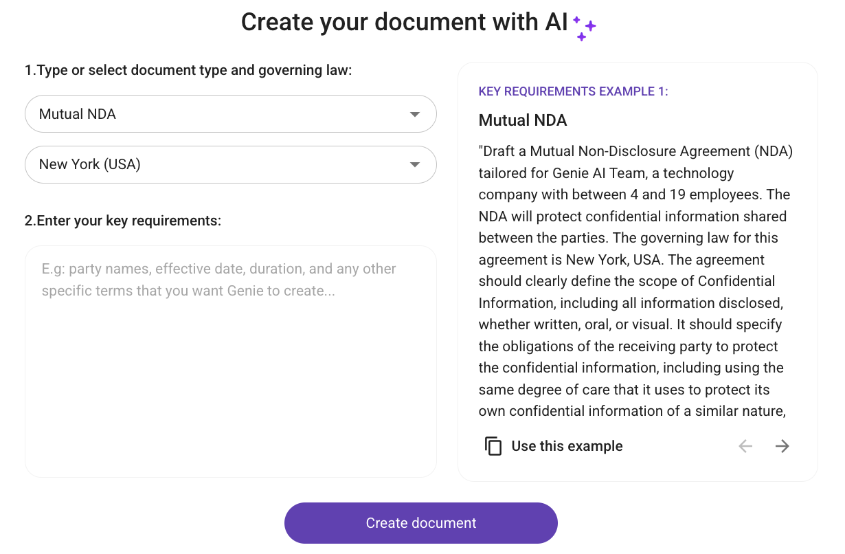 Whether starting from a blank page or a proven template, Genie AI helps you draft complete contracts in minutes. Use AI to generate entire agreements, fill key details automatically, and follow guided flows that keep everything compliant and business-ready.